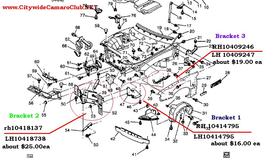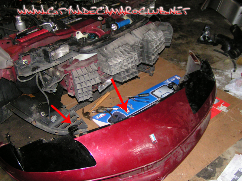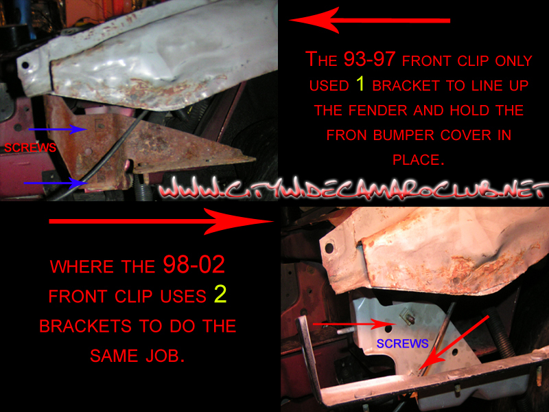 7th step now the confusing part is the 93-97 from clips only use on bracket to line up the fender and hold the front bumper cover in place where the 98-02 uses 2. |