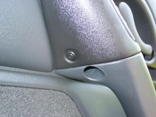 place against the door. The first picture shows how you are going to have to remove the small light. Push in and twist to remove the light from its housing. With the trim piece removed you are now ready to remove the door panel. These are not like many door panels which just have a ribbed plastic piece holding them in place. It is actually a hook which pulls the door panel tight to the door when installed. To remove the door panel, push in and up at the same time in various places on the door and you'll release these hooks. Take a look at the last picture here and it will give you an idea of what you have to do to release this hook. |