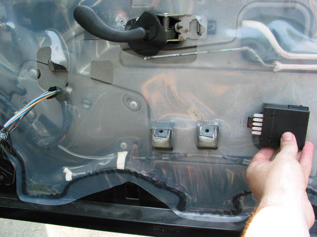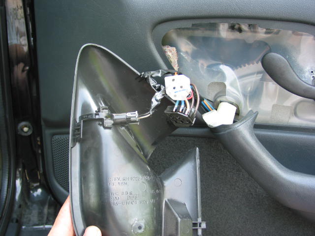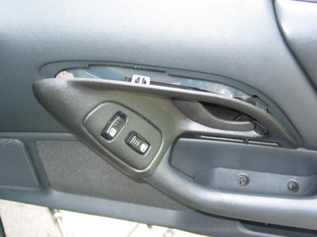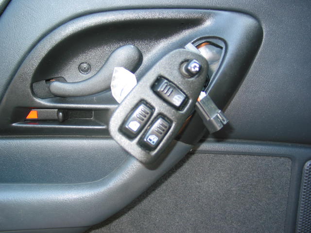 Ok... now on to the good stuff! The wiring for this mod will be done inside the passenger side door panel. I tried to find a place to hide the module by taking off just the plastic trim piece which goes around door handle but no luck... the entire door panel will need to be removed. Start off first by removing the power window/door lock switch panel and the trim piece around the door handle. Sometimes you can just pull up the trim piece around the switches but this time my fingernails were strong enough so I ended up popping the piece out as shown in the last picture then reaching in from behind and pushing the switch assembly up to pop it out. Once you get this out, unplug the connectors. |