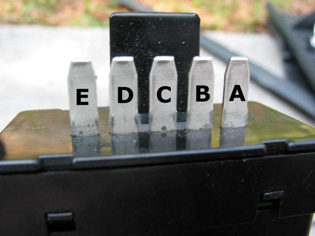 This is a picture of the underside of the passenger side power window switch. If you look closely at this picture you will see each wire slot is labeled. I'll refer to these labels later as well. | |