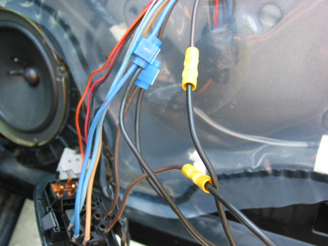 your module. Use YELLOW butt connectors are shown. Take the wire coming from terminal "E" of the module and with your butt connector, connect to the BROWN wire you just cut coming from cavity "C" of the power window switch. Take the last wire from the module (should be for terminal "D") and using your butt connector, connect the wire to the BROWN wiring going into the wiring bundle inside the door. |
