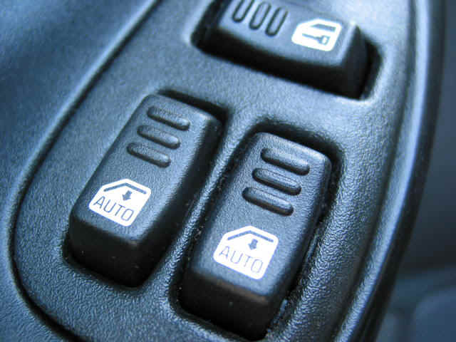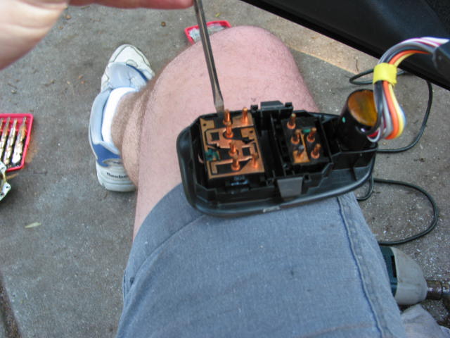 anything else off as shown in the first picture. Once off, you need to remove the two power window switches from the entire assembly. Use a screwdriver as shown and gently push down on the edges with the screw driver while pushing up from the bottom on the switch. The switches will pop out of the housing. The picture doesn't show this very good but just look at it closely and you'll see where you need to slightly pry it apart in order to "release" the switches. With the switches out, now comes the hard part. I wanted to use the NEW switch assembly in my car so what I did was remove the passenger side switch cover on my new switch and remove the driver side switch cover on my old switch. I then placed my old driver side switch cover over the passenger side switch of my new switch assembly. This gave me, on my new set of switches, both covers with the "AUTO" labeling on them :) It is kinda tricky to get these switch covers off. You'll need some patience and some very very small flat headed jewelers screw drivers. Use these very small screw drivers and gently pry the bottom portion of the switch "ears" out and over the tab on the switch. If you look closely at the switch you'll see what I'm talking about! Once you get your cover back on snap the switch back in place in the driver side switch assembly then snap the switch assembly back into the driver side door panel. You're done :) Since the passenger side window will also express down from the passenger side switch, I'm going to buy another switch assembly so I can have the "AUTO" label on that switch as well... just haven't got around to ordering one of these yet :) |